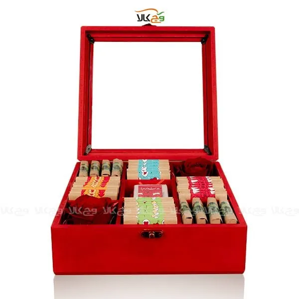 - جعبه مقوایی یا چوبی رنگ قرمز: طراحی خاص و چشمگیر با رنگ نمادین عشق
